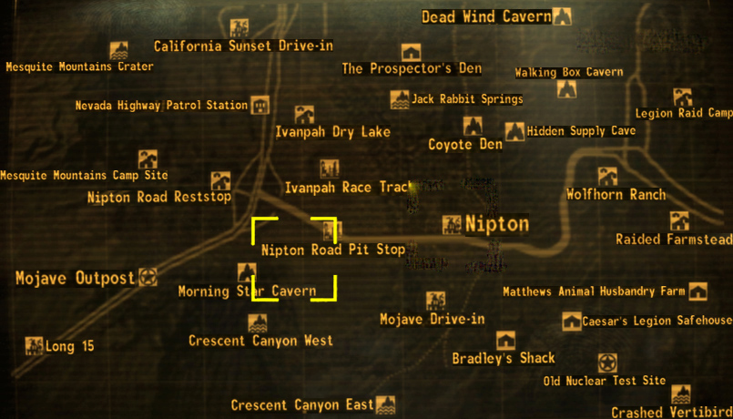 Akademie von Las Vegas ·Calada ·Campingplatz Las Vegas Bay ·Corn Creek Dunes ·Devil Peak ·Dritter Stock des Gomorrah ·Dry Lake ·Dünen von Las Vegas ·East Las Vegas ·Elephant Hill ·Erholungsgebiet Spring Mountains ·Floyd-Lamb-Schutzgebiet ·Garnet ·Malpais-Legionärslager ·Mount Perkins ·Mountain Springs ·Mummy Mountain ·Nordwestkanalisation ·Pahrump ·Piute Point ·Ripley ·Sandy Valley ·Summerlin ·Sunrise Mountain ·Südwestkanalisation ·Tal des Feuers ·Underpass ·Vault 24 ·Vault 74 ·Wheaton Springs