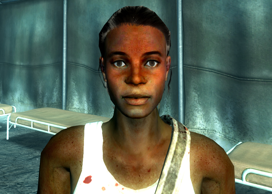 An overworked and slightly agitated field doctor for the United States Armed Forces with several years of experience under her belt, Adami is busy administering chems (usually Psycho) to wounded or mentally scarred soldiers at the US-Einsatzhauptquartier medical tent during Operation: Anchorage. Investigation into simulated holotapes reveals discrepancies between her simulated and real-life persona, as her records implicate General Chase in a scandal of drugging soldiers with Chems researched at Chase's pharmaceutical company.[1]