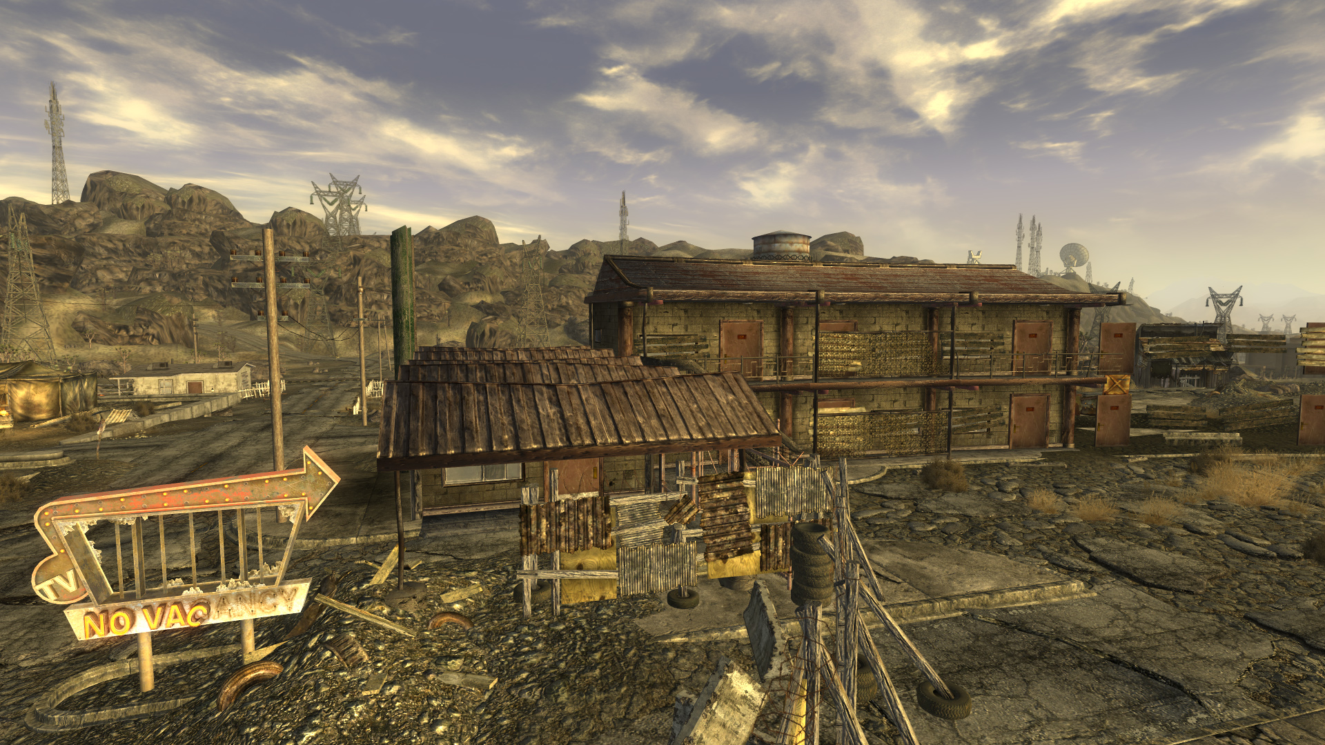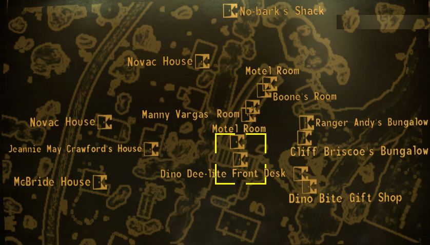Neben dem Hauptgebäude liegt ein Tor, das in einen eingezäunten Bereich führt, in dem sich die Motelzimmer und die Bungalows befinden. Der Spieler kann mit Jeannie May Crawford sprechen, um an ein Motelzimmer zu gelangen, das man für den Rest des Spiels als Heim benutzen kann. Das Zimmer kostet 100 Kronkorken, mit einer hohen Beliebtheit in bekommt man es allerdings gratis. (Novac)