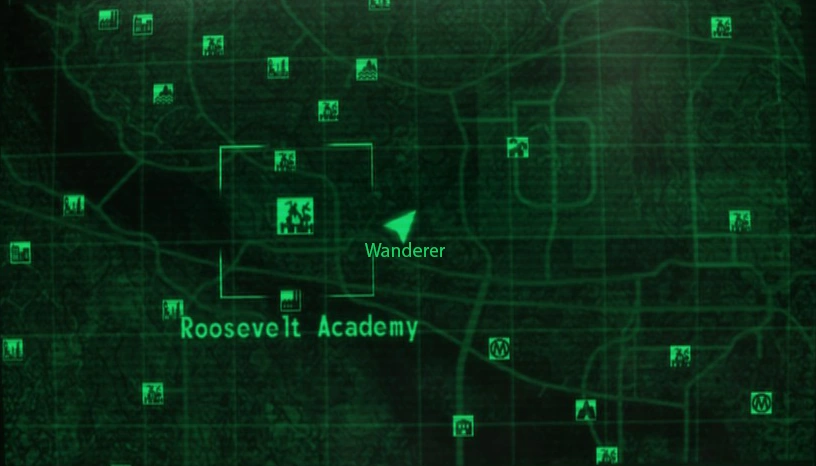 - Bei einer Straße östlich der Roosevelt-Akademie beginnt eine explosive Kette von Autos. Am Nordende, wo sich die Straße nach oben begibt, steht ein Bus. Nordöstlich dieses Busses, bei einer Straße, die runter in ein Tal führt, sieht man eine erhöhte Plattform, auf der ein Bett und Tisch stehen; vermutlich das ehemalige Zuhause des Wanderers. Die Plattform wird oft von den Felsen verdeckt, man sollte also genau hinschauen. Auf und um die Plattform herum wurden Lebensmittel verteilt, außerdem findet man eine Mini-Atombombe, ein Vorkriegsbuch, zwei Munitionskisten und zwei relativ seltene Hundenäpfe.
