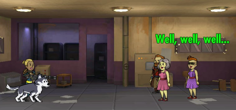 Der Bewohner kommt hier in einen 2-fach Raum, in dem keine Gegner sind. Also kann der Spieler die 2 Schränke plündern, die hier zu plündern sind. Weiter geht es mit einem weiteren 2-fach Raum in dem 3 der hiesigen Bewohner den Spieler in einen Dialog verwickeln. Der Ausgang des Dialogs entscheided, ob der Spieler hier kämpfen muss oder nicht. Da in diesem Fall gekämpft werden musste, muss der Bewohner diese besiegen. Der Spieler kann anschließend von den Gegnern und von 2 Behältern plündern und dann seinen Bewohner zum nächsten Raum schicken. In diesem 1-fach Raum wird dieser von 3 RAD-Kakerlaken angegriffen. Sind diese getötet, kann der Spieler den Bewohner weiter zum nächsten Raum schicken. in diesem 1-fach Raum wird der Bewohner von einem RAD-Skorpion angegriffen. Ist dieser getötet, kann der Spieler hier noch von einem Schrank plündern und seinen Bewohner über den Aufzug eine ebene tiefer schicken.