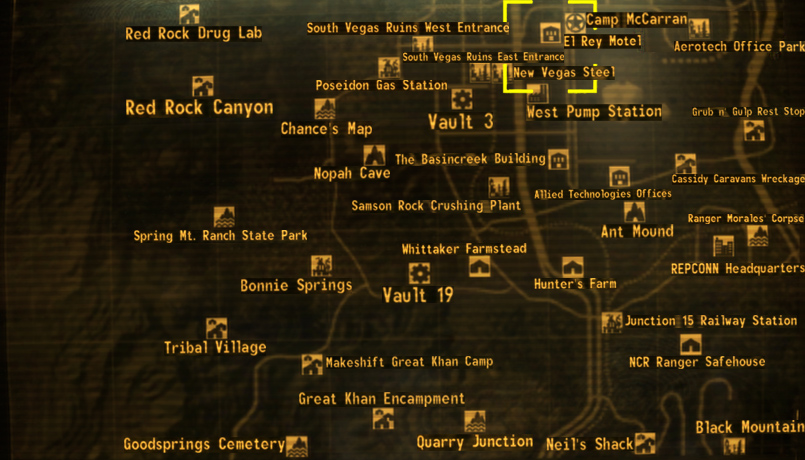 - Die Karte die im Lösungsbuch (Fallout: New Vegas) enthalten ist, zeigt das Motel auf der Pip-Boy-Karte als Fabrik und nicht wie es richtig ist als Gebäude.