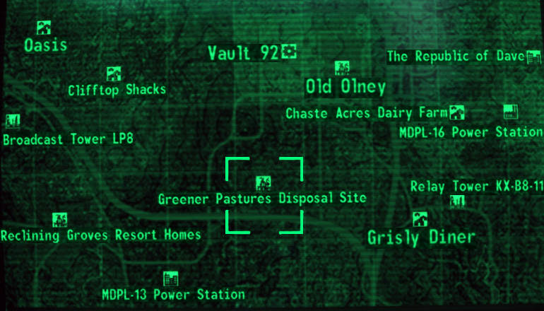 Die Endlagerstätte Greener Pastures ist heute eine der radioaktiv verseuchten Gebiete im Ödland der Hauptstadt. Es liegt nordwestlich des Tempel der Einheit, südwestlich von Old Olney und nordöstlich des Kraftwerk MDPL-13. Es ist auch ein Ort mit Zufallsbegegnungen.