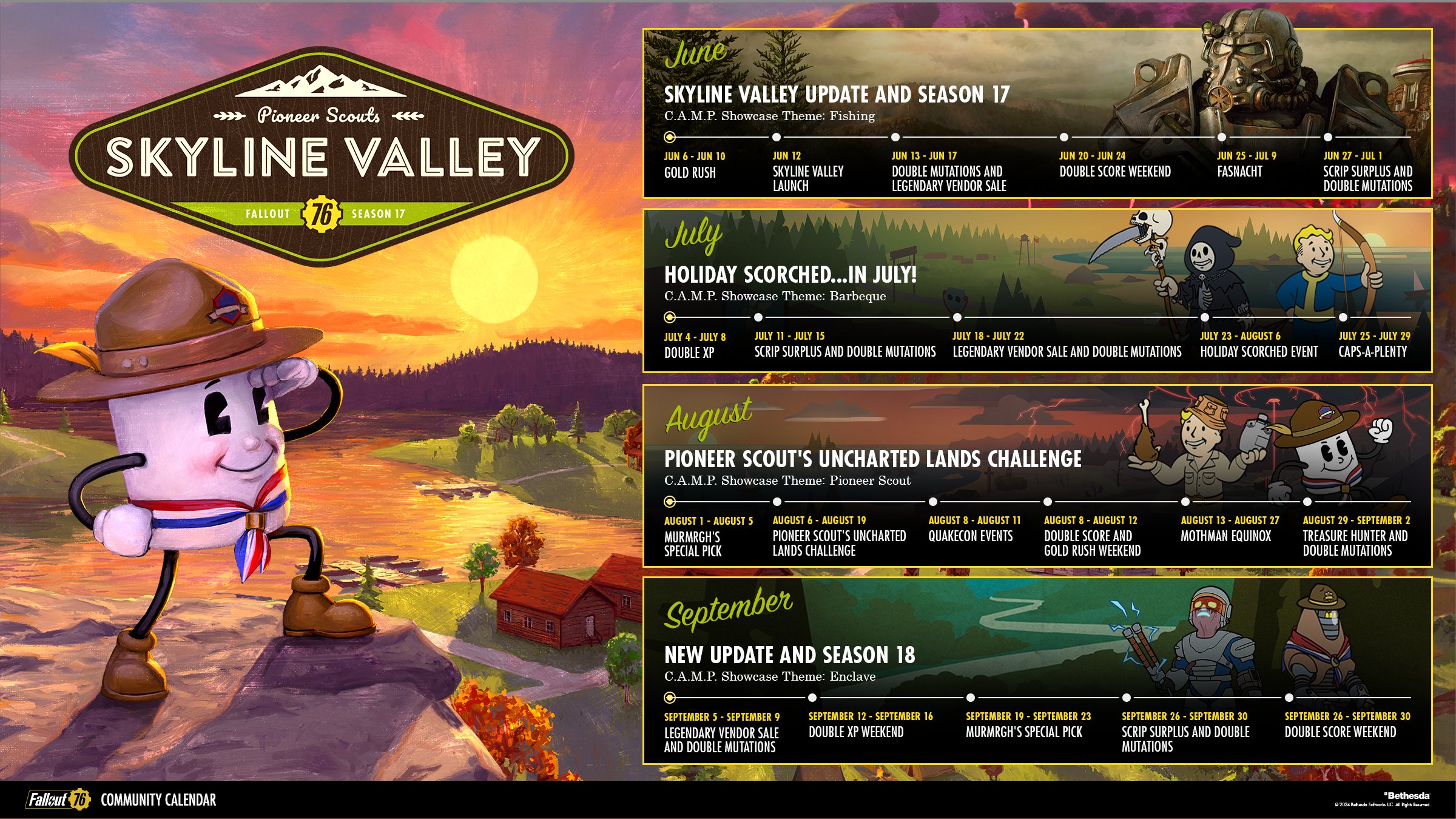 Fallout: Die Spieler erfahren mehr über das Forced Evolutionary Virus (FEV) und die Verwandlung von Menschen in Supermutanten. Zudem lernen sie die Stählerne Bruderschaft und Roger Maxson kennen, dessen Stimme in Fallout 76 zum ersten Mal zu hören ist.