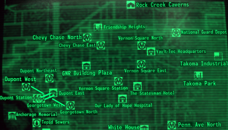 Kommt man aus dem Eingang in Georgetown, findet man einen Eat'o'Tronic 3000-Automaten. Darin befindet sich ein Stimpak und Mentats zusammen mit einigen anderen Lebensmitteln.