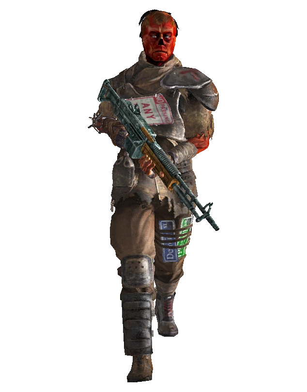 An additional, unused variant of the irradiated heavy trooper exists within the resources of Lonesome Road. Also called "irradiated heavy trooper", this version differs primarily in that it uses the default SPECIAL statistics for NCR troopers - 5 for all statistics. It also is equipped with a Minigun loaded with 5mm AP rounds, rather than the random weapon selection found in the standard version. Internally this version has the Editor ID NVDLC04NukeNCRColonel, indicating that this may have been an early stand-in for Colonel Royez.