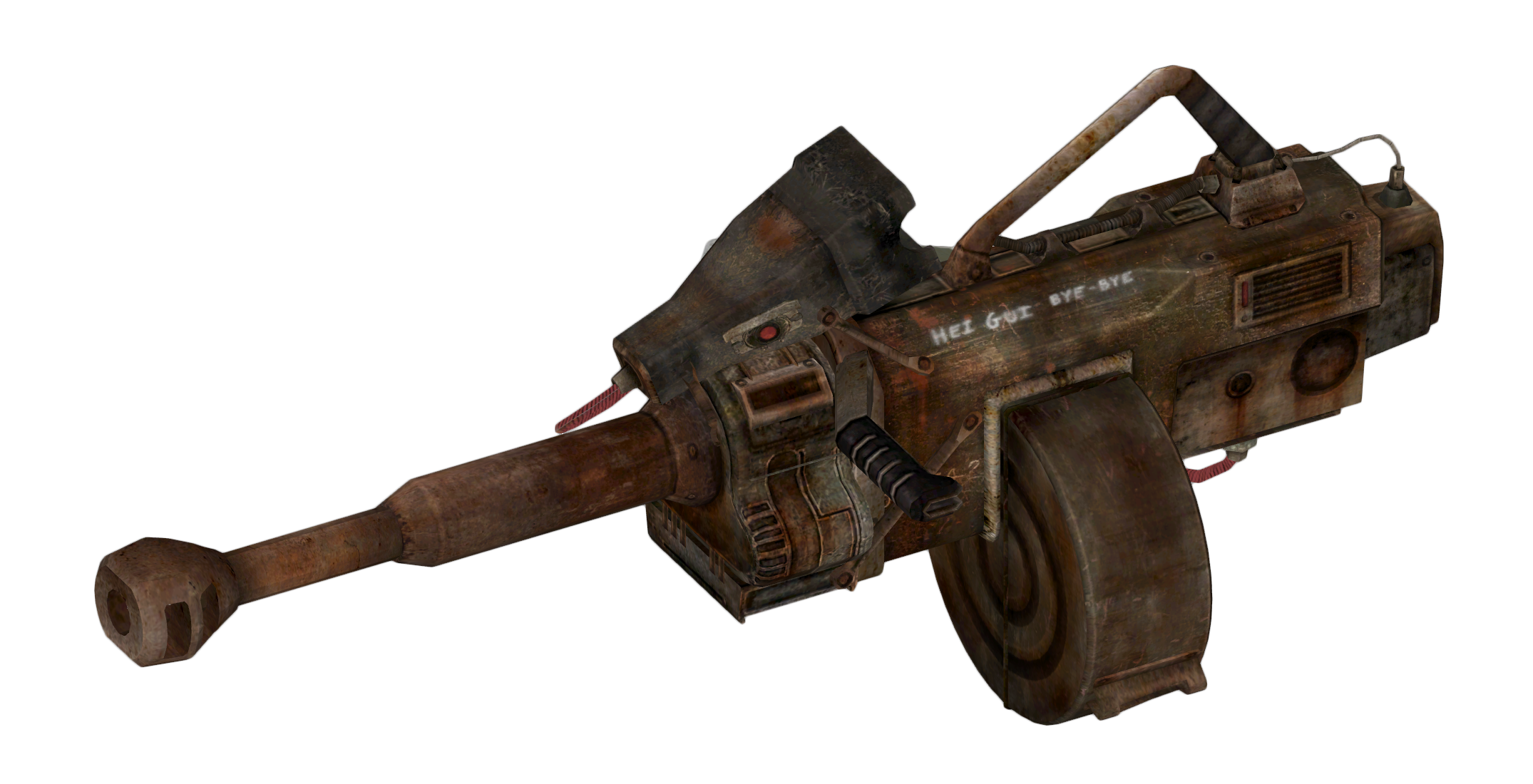 Optisch ist die Waffe in keinem guten Zustand. Sie sieht extrem verrostet und verbraucht aus. Der im Vergleich zum Standard Granaten-MG höhere Schaden beruht auf der Nutzung von 40-mm-Granaten, statt der weiter verbreiteten und billigeren 25-mm-Granate. Die Größe der 40-mm-Granaten beschränkt auch die Munitionskapazität der Waffe auf 18, was 12 weniger, als bei der normalen Waffe ist. Auch wiegt sie 40-mm-Granate etwas mehr, was für den Hardcore-Modus relevant ist. Wie die meisten einzigartigen Waffen im Spiel, lässt sich auch diese hier nicht modifizieren.