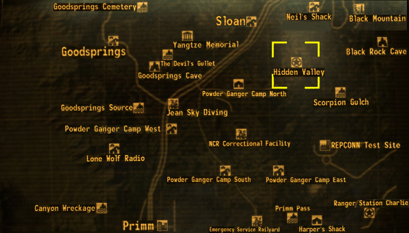 Hidden Valley ist ein umzäuntes Gelände eingebettet zwischen Hügeln und Felsen grob nordöstlich der RNK-Justizvollzugsanstalt (NCRCF) und südöstlich von Sloan. Das Tal ist das Zuhause zahlreicher Rindenskorpione und Überreste der Stählernen Bruderschaft die einst HELIOS One besetzt hielten, bevor sie von der RNK während der Operation: Sunburst besiegt wurden.