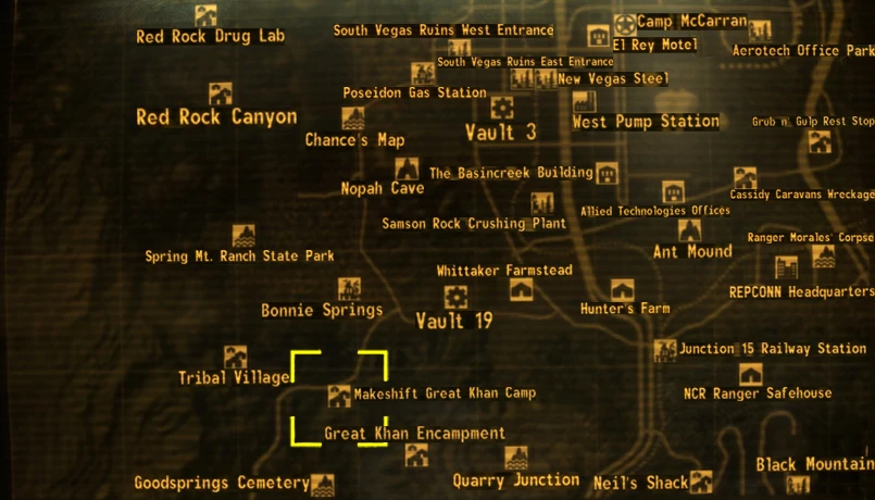 Akademie von Las Vegas ·Calada ·Campingplatz Las Vegas Bay ·Corn Creek Dunes ·Devil Peak ·Dritter Stock des Gomorrah ·Dry Lake ·Dünen von Las Vegas ·East Las Vegas ·Elephant Hill ·Erholungsgebiet Spring Mountains ·Floyd-Lamb-Schutzgebiet ·Garnet ·Malpais-Legionärslager ·Mount Perkins ·Mountain Springs ·Mummy Mountain ·Nordwestkanalisation ·Pahrump ·Piute Point ·Ripley ·Sandy Valley ·Summerlin ·Sunrise Mountain ·Südwestkanalisation ·Tal des Feuers ·Underpass ·Vault 24 ·Vault 74 ·Wheaton Springs