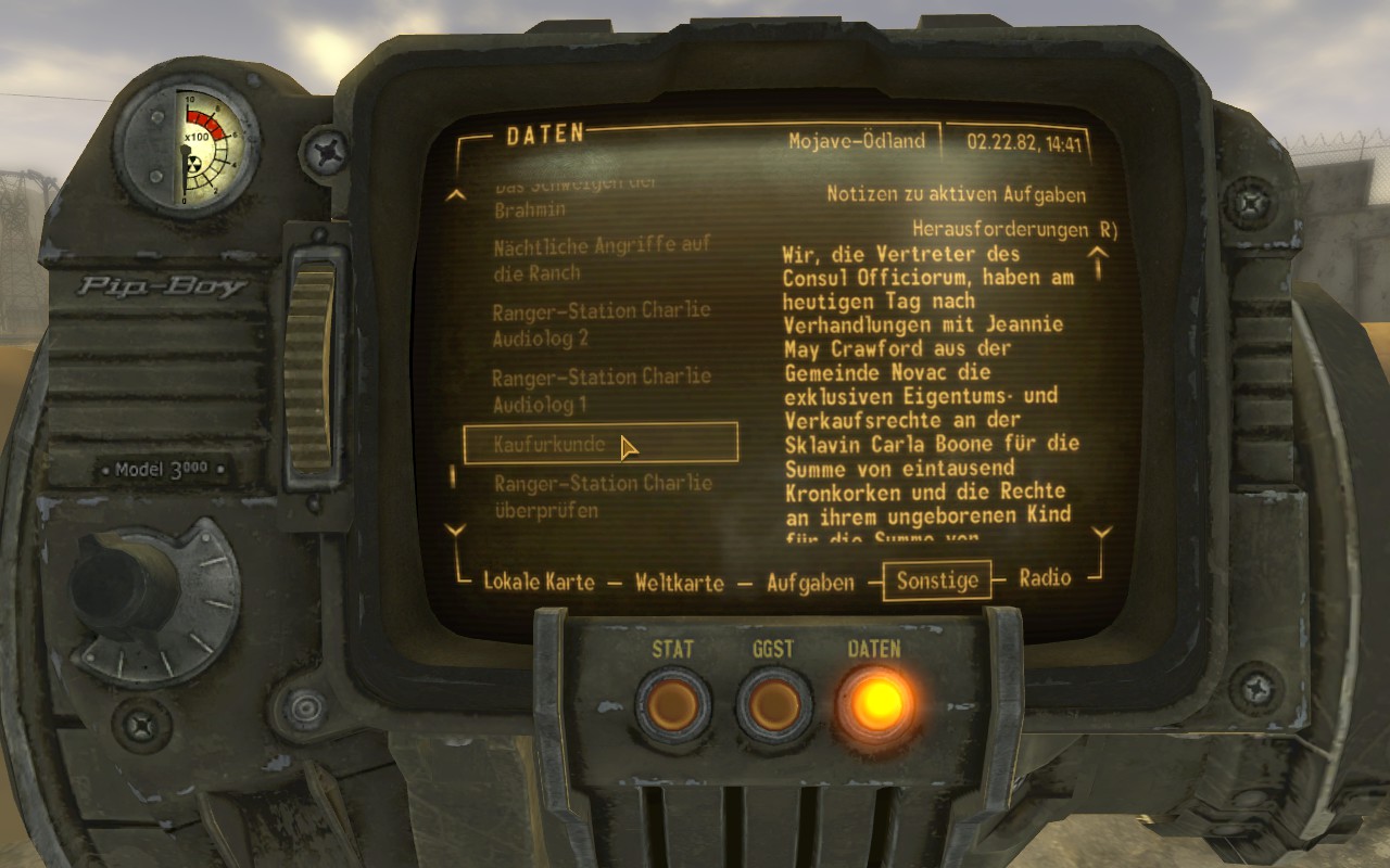 Wir, die Vertreter des Consul Officiorum, haben am heutigen Tag nach Verhandlungen mit Jeannie May Crawford aus der Gemeinde die exklusiven Eigentums- und Verkaufsrechte an der Sklavin (Novac)Carla Boone für die Summe von eintausend Kronkorken und die Rechte an ihrem ungeborenen Kind für die Summe von fünfhundert Kronkorken erstanden, deren Erhalt hiermit bestätigt wird. Wir kommen mit erwähnter Jeannie May Crawford überein, dass wir über das umfassende Recht am Wiederverkauf besagter Sklavin und ihres Nachwuchses verfügen. Die Entrichtung zusätzlicher fünfhundert Kronkorken wird fällig nach erfolgreicher Reifung des Fötus; der Anspruch darauf ist garantiert durch Besitz dieses Dokuments.