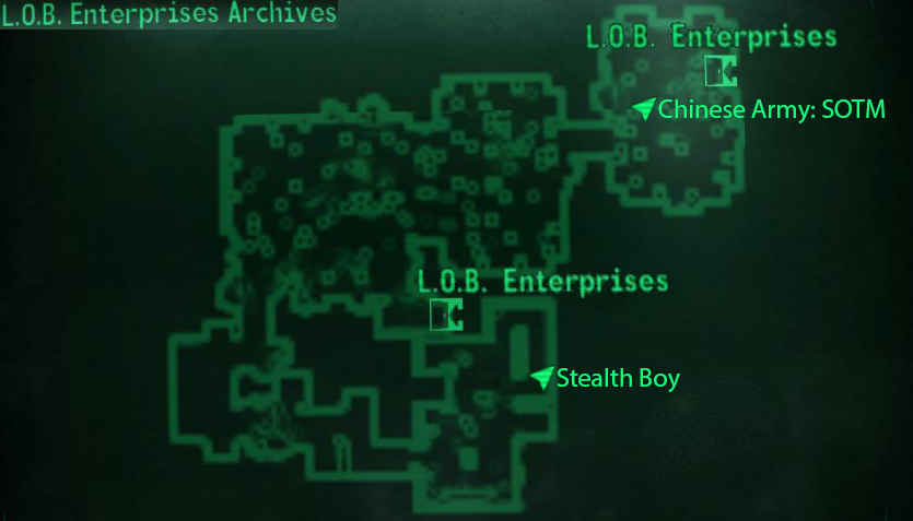 - Stealth Boy: In the generator area of the archives past the bathrooms, on a shelf on the eastern wall.