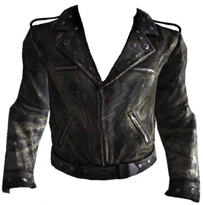 A "Perfecto"-Stil Lederjacke mit einer Schlange Emblem auf dem Rücken, hat zwei Ärmel, auf der Spitze eines Vault-101-Overall getragen wird, durch die Tunnel Schlangen Bande in verwendet. (Vault 101)
