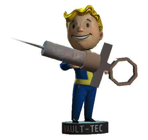 - Die Wackelpuppe erhöht die Heilung nicht additiv, sondern multiplikativ. Standardmäßig (d. h. ohne das Extra Arzt) steigert sie die Heilung von Stimpaks von 30 % auf 33 % Gesundheit usw. für die folgenden Ränge (40 % -> 44 %, 60 % -> 66 % usw.).
