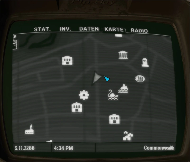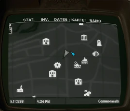 Fallout 4. Nahegelegene Schnellreise-Punkte wären beispielsweise Swans Teich und Park Street Station.