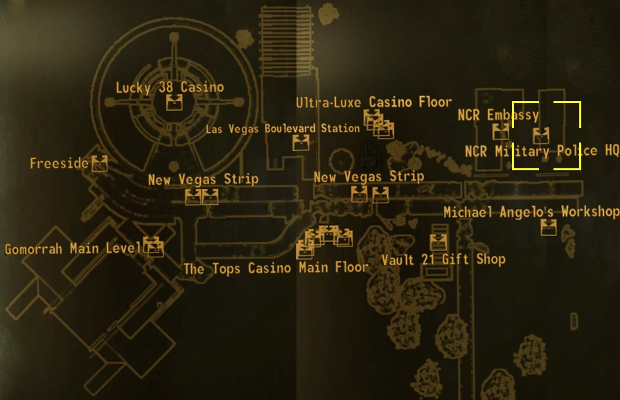 - In dem Waffenlager, das sich hinter einer "schwer" verschlossenen Tür nahe des linken hinteren Bereichs des Hauptraumes befindet, ist ein Stealth Boy zusammen mit viel Munition. Diese Tür zu knacken, führt dazu, dass die MP's den Spieler angreifen und verringert sowohl das Karma als auch die Reputation bei der RNK. Sollte das Karma hoch genug sein, wird dies jedoch nicht passieren und die Tür wird auch nicht rot markiert, wenn man sie knacken will. Marie Pappas hat den Schlüssel zum Waffenlager. Sie ist in der RNK-Botschaft gegenüber und kann bestohlen werden, um an den Schlüssel zu gelangen.