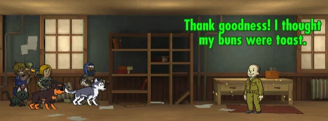 Nachdem man diesen Dialog beendet hat, ist das Hauptziel des Quest erreicht, man sammelt noch schnell alle Behälter ein, und könnte theoretisch zurück zum Vault gehen. Man kann aber auch die weiteren Räume durchforsten..
