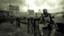 - Südlich der Fairfax-Ruinen auf einer Plattform einer Hausruine mit einem Automatischem Geschützturm und einem Sammlerhund, wird von zwei Raidern attackiert.