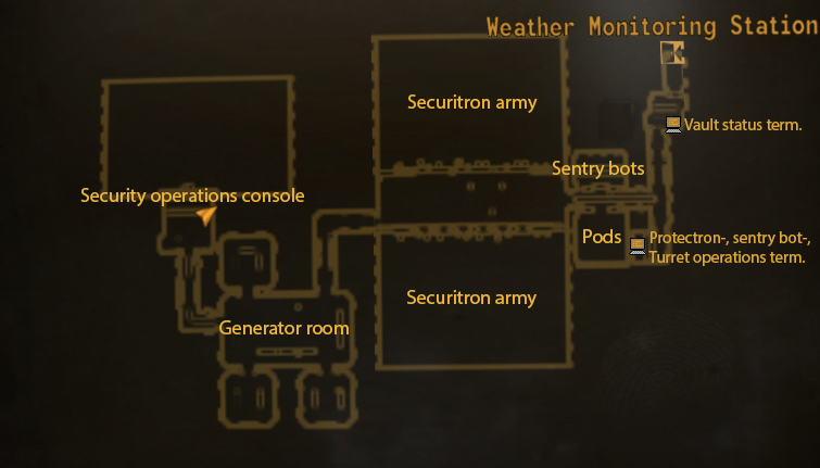 Die Anlage ist eine relative kleine Vault und leicht verstrahlt. Mr. House kann über einen Terminal im ersten Raum kontaktiert werden. Er hat von dort aber keinen Zugriff auf die Vault Sicherheit selbst. Nachdem der erste Protektron ausgeschaltet wurde, kann man mittels drei Terminals die automatischen Geschütztürme und die Protektrons deaktivieren. Der dritte Terminal für die Wach-Bots ist unbrauchbar. Im nächsten Raum finden sich die Geschütztürme und zwei Protektrons. Durch die Fensterreihen rechts und links hat man einen Blick auf die Sekuritron-Armee. Weiter hinten in der Vault gibt es zwei Generatoren Räume und die Konsole, mit der man die Armee auf das Mark II Betriebssystem upgraden kann.