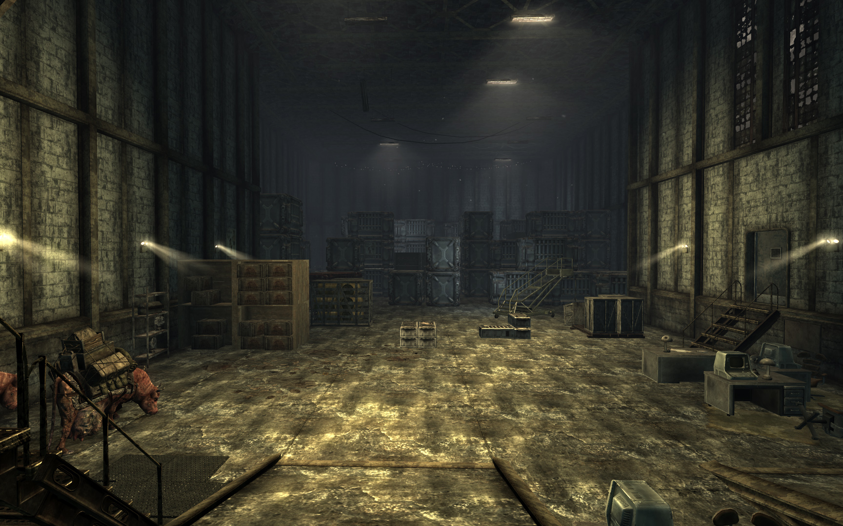 Was Warenhaus besteht aus einem einzelnen Raum, zu Hälfte gefüllt mit diversen Aktenbschränken und Schreibtischen. Die andere Hälfte des Raums ist mit gestabelten Metallkisten gefüllt. Es gibt eine Treppe hoch zu einem leeren Laufsteg.