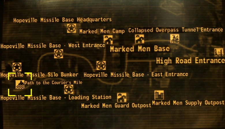 Dieser Zugang zur Kuriermeile befindet sich direkt unterhalb des Hopeville-Raketensilobunkers. Er besteht aus einer Straße mit einer unsichtbaren Mauer, die das Vorankommen verhindert. Die Kartenmarkierung erscheint erst nach Abschluss der Quest Der Start. Ab diesem Moment kann man den Weg auch betreten.