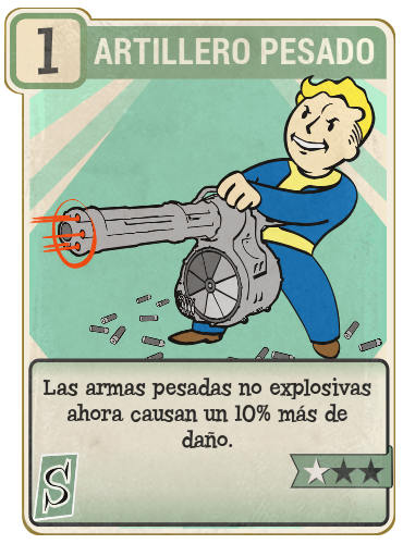 - Para las armas pesadas explosivas, Artillero pesado también se aplica, junto con el extra Experto en demoliciones haciendo que el daño de estas armas pase del doble de daño normal a cuatro veces el daño del arma si se tienen los dos extras al máximo nivel.
