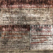 En la puerta de entrada a la base hay una torre de vigilancia y una garita, desde aquí, ubicado al oeste, podrás ver el edificio de la torre de control, que es inaccesible, y los hangares. Hacia el este hay dos pistas de aterrizaje paralelas ocupando gran parte de las instalación militar. En medio de ambas pistas los Boomers han montado unos invernaderos, a los que no podrás acceder, un sembradío de maíz con un sistema de irrigación de agua proveniente del lago Mead y unas tiendas de campaña con algunas literas. Un poco antes está el edificio de sistema de filtración de agua y unas tiendas con unos bidones en su interior. Pasando del sembradío, al norte, están los paneles de Nellis y el edificio de generadores de paneles de Nellis que son los responsables de proporcionar energía a la base. En el extremo septentrional de la base hay una torre de vigilancia, un obús en desuso (a todo lo largo de ambas pistas de aterrizaje encontrarás unos cuantos más) y un pequeño cementerio sobre la esquina noreste.