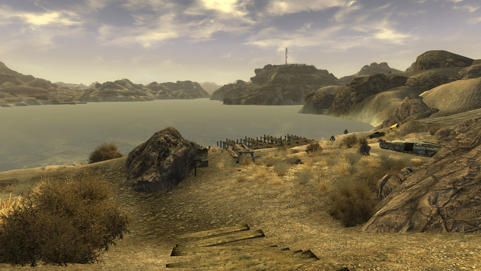 El muelle está repleto de acechadores de lago, al igual que la carretera que conduce a Boulder City. Busca en la roca ahuecada marcada con la leyenda "The sun is killing me" (el sol me está matando) que hay a un lado del camino, allí encontrarás un botín aleatorio. El campamento en sí tiene varias mesas de picnic, asadores, un tráiler con un colchón donde podrás descansar (aunque es un poco peligroso) y coches destartalados. No hay ningún objeto útil. Al sur hay una fogata rodeada por neumáticos.
