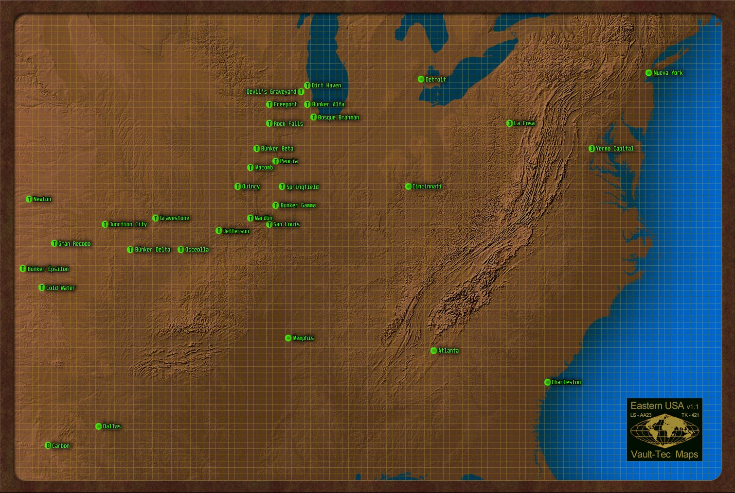 El este, al igual que el resto de los Estados Unidos de la posguerra, es un Yermo sin ley, inhóspito y estéril. La mayor parte consiste en yermos estériles donde sólo los más fuertes pueden ganarse la vida con los desechos irradiados. La Gran Guerra no perdonó al este bajo ningún concepto; sin embargo, algunas áreas fueron menos destruidas que otras, lo que permitió crear pequeñas comunidades, algunas capaces de prosperar. Además, la vida en el yermo, sin importar el lugar, puede vencer al más fuerte de los hombres. No es ningún secreto que los clanes de saqueadores viven en los abrasadores yermos. Estos grupos de personas toman lo que pueden por la fuerza, sin escatimar esfuerzos en su cometido. Es un hecho triste que no muchas organizaciones son capaces de proteger a las numerosas tribus pacíficas y pueblos pequeños, sin embargo, algunos sí se ofrecen a brindar protección y ayuda, como los Rangers de Reilly, que son un feroz pero bondadoso grupo de mercenarios que opera en Washington, DC. Incluso los Reguladores, que han prometido librar a los yermos de todo mal, se los puede ver en algunos yermos. Sin embargo, a medida que la vida continúa en los yermos orientales, una gran facción de caballeros de metal, conocida como la Hermandad del Acero, trata de hacer que la vida sea un poco más fácil en las áreas de Washington D.C.