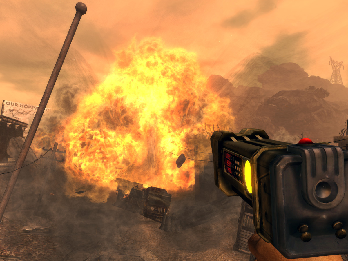 Una vez que se haya acabado con el grupo, diríjase hacia el sur y verá la cabeza nuclear justo en frente del personaje del jugador. Simplemente equipe el detonador láser, apunte a la cabeza nuclear y mantenga presionado el gatillo durante unos segundos. La cabeza nuclear explotará (varias veces) y el paisaje cambiará, lo que permitirá que el mensajero avance y regrese al área de los cuarteles. Gire a la izquierda y siga el camino un poco para ver otra cabeza nuclear; detrás hay algunos hombres marcados, y el camino continúa hasta el túnel del paso elevado colapsado.