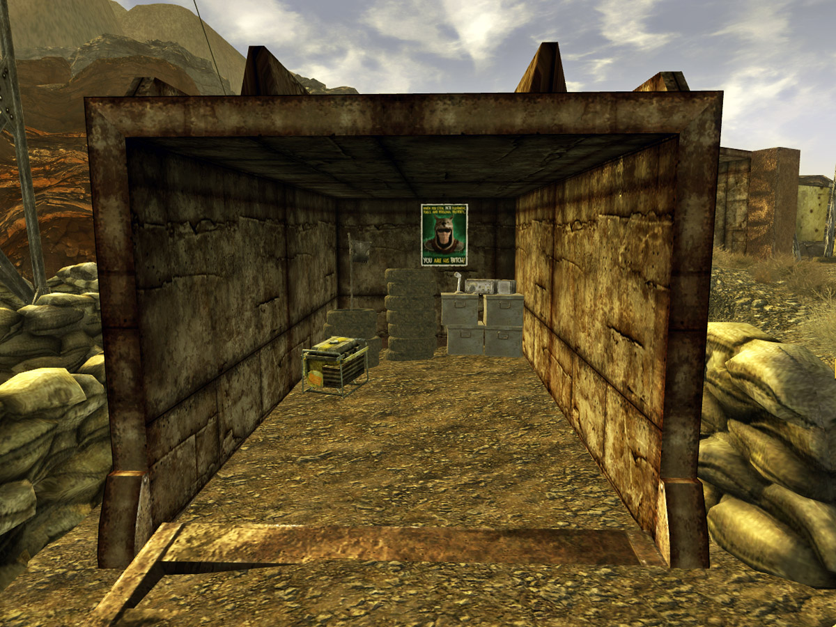En las mesetas al noreste de Bitter Springs hay una serie de muros de madera reforzados con metal, contenedores y cargamentos dispuestos a modo de línea defensiva contra los necrófagos cercanos. Es la estación Ranger de la RNC que se encuentra más al oriente en el Yermo de Mojave. En el interior del perímetro defensivo hay dos contenedores con afiches propagandísticos y un equipo de radio en uno de ellos. En otro de los contenedores hay algunas camas donde no podrás descansar ya que tienen dueño y, justo al lado, otro contenedor con una gran cantidad de cajas de municiones, algunas de las cuales están vacías. El último de los contenedores posee algunos bidones dentro de una caja y algo de alimentos. El lugar es habitado por 2 Rangers de la RNC, el Oficial al mando Tilden y el Ranger Ericsen. Además de la torre de radio que verás a la distancias según te acerques, no hay objetos de relevancias en esta ubicación.