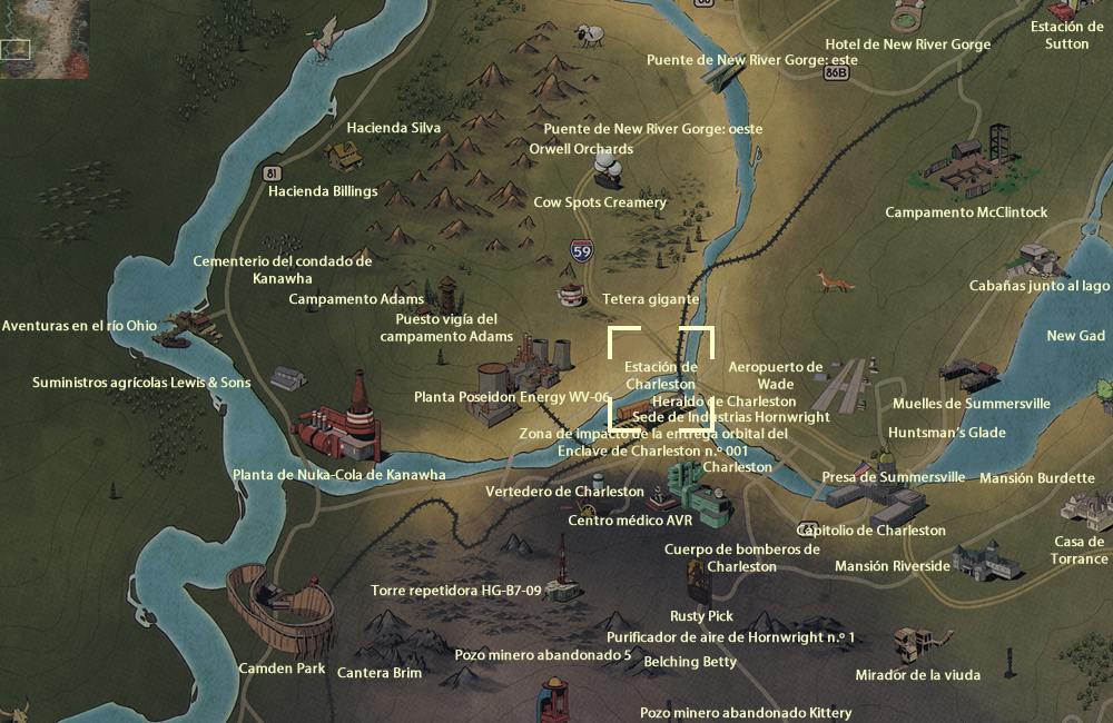 Aeropuerto de Wade ·Arktos Pharma ·Autocine Bleeding Kate ·Aventuras en el río Ohio ·Bolton Greens ·Cabaña aislada ·Cabaña de la familia Groves ·Cabaña del fabricante de licores ·Cabaña del mirador ·Cabañas del río Alpine ·Cabañas junto al lago ·Campamento Adams ·Campamento de la supervisora ·Campamento McClintock ·Cementerio del condado de Kanawha ·Centro de investigación agrícola de Vault-Tec ·Charleston (Capitolio de Charleston ·Centro médico AVR ·Cuerpo de bomberos de Charleston ·Depósito de trenes de Charleston ·Edificio del Heraldo de Charleston ·Estación de Charleston ·Sede de Industrias Hornwright ·Vertedero de Charleston) ·Circuito de tierra del condado de Tyler ·Cow Spots Creamery ·Deportes de invierno White Powder ·Desguace de Gorge ·El Wayward ·Estación de transmisión 1AT-U03 ·Fábrica de artillería Black Mountain ·Faro de Landview ·Feria del condado de Tyler ·Flatwoods (Logia de Green Country ·Puesto vigía de Flatwoods) ·Granja Anchor ·Granja industrial Sunshine Meadows ·Hacienda Aaronholt ·Hacienda Billings ·Hacienda Silva ·Hacienda Wixon ·Heladería de Lady Janet ·Helvetia ·Horizon's Rest ·Hotel de New River Gorge ·Hunter's Ridge ·Isla de los sanguinarios ·La Mira ·La pocilga ·La zona objetivo (anteriormente mansión Burdette) ·Las Profundidades ·Laboratorio de las Hermanas Darling ·Mansión Clancy ·Mansión Riverside ·Mina de Gauley ·Morgantown (Aeropuerto de Morgantown ·Alimentos procesados de Mama Dolce ·Depósito de trenes de Morgantown ·Estación de Morgantown ·Instituto Morgantown ·Salón de tatuajes de Gran Al ·Universidad de Vault-Tec ·Zona de las fraternidades) ·New Gad ·Orwell Orchards ·Pabellón Marigold ·Perritos calientes de Hillfolk ·Planta de Nuka-Cola de Kanawha ·Planta Poseidon Energy WV-06 ·Point Pleasant (Museo del hombre polilla ·Silver Bridge) ·Pub Portside ·Puente de New River Gorge ·Puesto vigía de Kanawha oriental ·Puesto vigía de Kanawha septentrional ·Puesto vigía del campamento Adams ·Refugio 51 ·Refugio 76 ·Serrería de Gilman ·Slocum's Joe ·Subestación eléctrica Poseidon PX-01 ·Subestación eléctrica Poseidon PX-02 ·Sugarmaple ·Suministros agrícolas Lewis & Sons ·Suministros para minería Greg ·Summersville (Duncan & Duncan Robotics ·Lago de Summersville ·Muelles de Summersville ·Presa de Summersville) ·Sutton (Estación de Sutton ·Hogar de la supervisora) ·Taller de los Hermanos Wilson ·Tetera gigante ·Torre repetidora EM-B1-27 ·Torre repetidora HN-B1-12 ·Tratamiento de aguas Tygart ·Villa de verano de Hornwright ·WV Lumber Co.