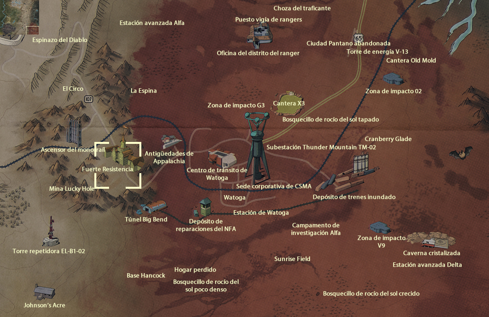 - ↑ Pantallas de carga de Fallout 76: "El Fuerte Resistencia, construido sobre las ruinas del manicomio Allegheny, sirvió como cuartel general de la nueva división de la Hermandad del Acero en Appalachia."