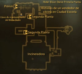 - Llave de mantenimiento del Bison Steve, en la habitación bloqueada con una dificultad difícil, en la recepción (justo a la derecha según entras al hotel), sobre una mesa.