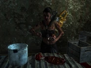 Se encuentra detrás de una mesada de metal, recogiendo los desagradables trozos de órganos y huesos de la carne de las bestias mutantes, y mezclándolas con agua de los ríos locales.