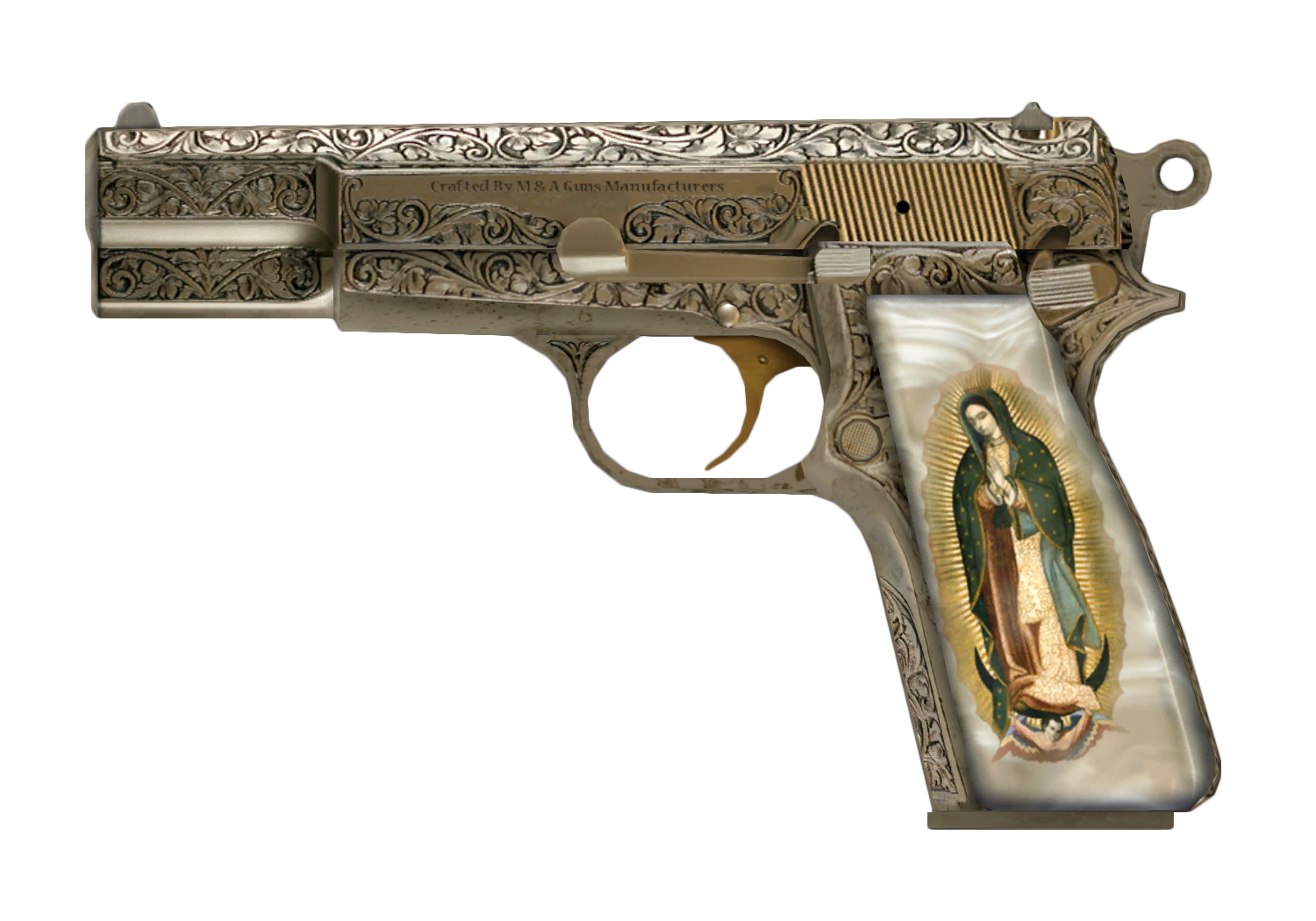 Un modelo único de una Pistola de 9 mm M&A hecha por los Fabricantes de Armas M&A, el arma tiene una imagen de Nuestra Señora de Guadalupe pintada en el mango de perlas, una figura católica muy conocida y una representación de la mujer bíblica del Apocalipsis. Todo el cuerpo de la pistola está grabado con hiedra y detalles florales y con un acabado de níquel pulido. Es, junto con el Cuchillo de Chance, la responsable de una gran cantidad de muertes en contra de Maníacos en la novela gráfica de All Roads. Es también el arma utilizada por Benny para disparar al Mensajero en la escena de introducción de Fallout: New Vegas.