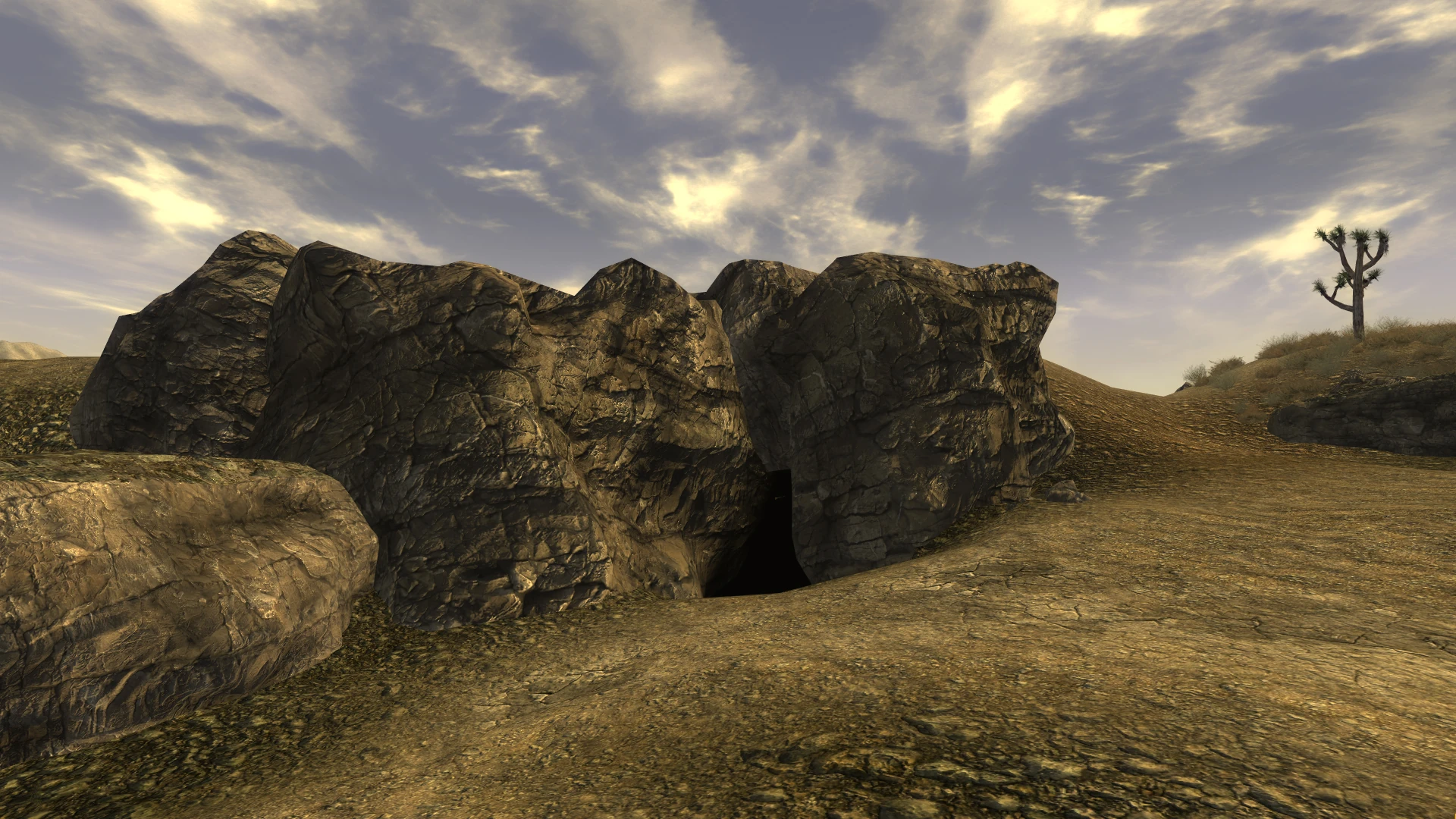 A las afueras del perímetro irradiado del campamento Searchlight y casi junto a las minas Coyote se encuentra un agujero en el suelo, cerca a la torre de agua. Comprueba la roca ahuecada que hay a la izquierda y por encima de la entrada.