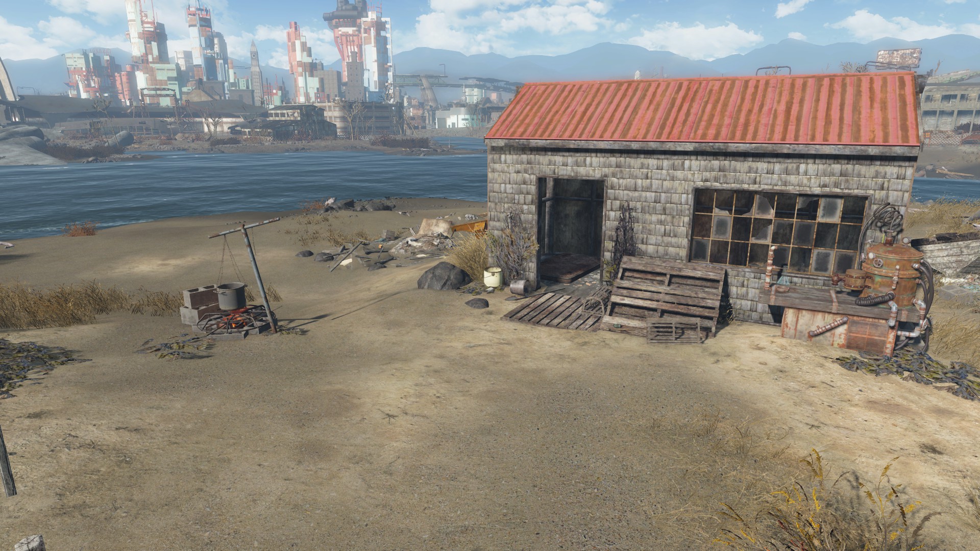 En el lado oeste de la casa se encuentra el taller del asentamiento, una bomba de agua y una valla perimetral de madera que se extiende hacia el norte y el noreste. Justo detrás de la valla hay un bote de madera, además de un camión y un tractor parcialmente enterrados en la arena, todos los cuales se pueden desguazar si el asentamiento se alía con el Único Superviviente.