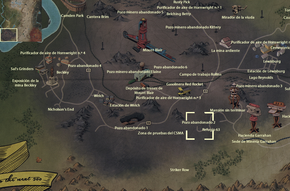 Bastion Park ·Beckley (Exposición de la mina Beckley ·Sal's Grinders) ·Belching Betty ·Camden Park ·Campo de trabajo Rollins ·Cantera Brim ·El fango funciona ·Gasolinera Red Rocket ·Hacienda Garrahan ·Hacienda Hornwright ·La mina ardiente ·Lago Reynolds ·Lewisburg (Cementerio de Pleasant Hills ·Estación de Lewisburg) ·Lugar de la emboscada en la torre de energía ·Mansión sin terminar ·Mirador de la viuda ·Mount Blair (Depósito de trenes de Mount Blair ·Pozo abandonado 6 ·Pozo minero abandonado Elaine) ·Pozo abandonado 1 ·Pozo abandonado 2 ·Pozo abandonado 4 ·Pozo minero abandonado 3 ·Pozo minero abandonado 5 ·Pozo minero abandonado Kittery ·Purificador de aire de Hornwright n.º 1 ·Purificador de aire de Hornwright n.º 2 ·Purificador de aire de Hornwright n.º 3 ·Purificador de aire de Hornwright n.º 4 ·Refugio 63 ·Rusty Pick ·Sede de Minería Garrahan ·Striker Row ·Torre repetidora HG-B7-09 ·Welch (Estación de Welch) ·Zona de pruebas del CSMA
