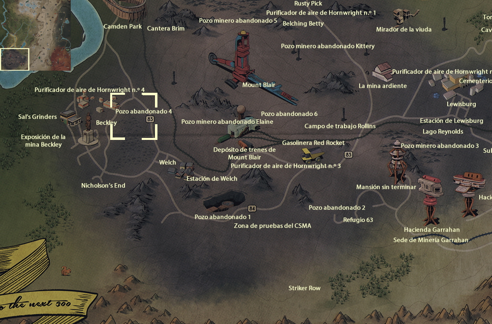 Bastion Park ·Beckley (Exposición de la mina Beckley ·Sal's Grinders) ·Belching Betty ·Camden Park ·Campo de trabajo Rollins ·Cantera Brim ·El fango funciona ·Gasolinera Red Rocket ·Hacienda Garrahan ·Hacienda Hornwright ·La mina ardiente ·Lago Reynolds ·Lewisburg (Cementerio de Pleasant Hills ·Estación de Lewisburg) ·Lugar de la emboscada en la torre de energía ·Mansión sin terminar ·Mirador de la viuda ·Mount Blair (Depósito de trenes de Mount Blair ·Pozo abandonado 6 ·Pozo minero abandonado Elaine) ·Pozo abandonado 1 ·Pozo abandonado 2 ·Pozo abandonado 4 ·Pozo minero abandonado 3 ·Pozo minero abandonado 5 ·Pozo minero abandonado Kittery ·Purificador de aire de Hornwright n.º 1 ·Purificador de aire de Hornwright n.º 2 ·Purificador de aire de Hornwright n.º 3 ·Purificador de aire de Hornwright n.º 4 ·Refugio 63 ·Rusty Pick ·Sede de Minería Garrahan ·Striker Row ·Torre repetidora HG-B7-09 ·Welch (Estación de Welch) ·Zona de pruebas del CSMA