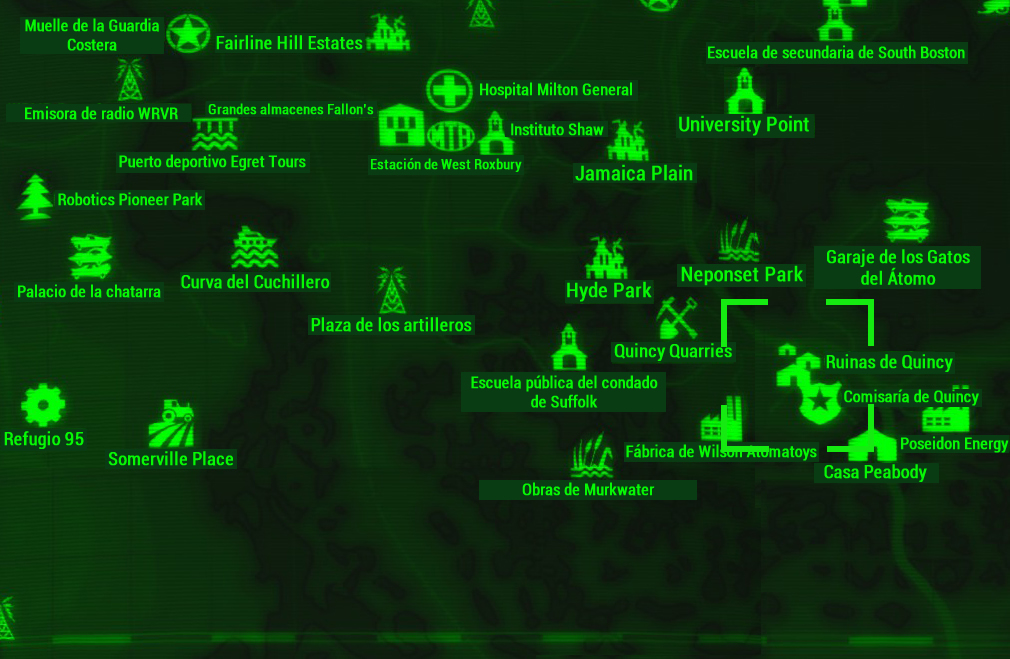 | Nick Valentine | Entrada sureste | "Quincy no era un lugar muy turístico antes de que llegaran los artilleros." |