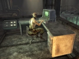 - El área ahora se puede saquear más a fondo. Frente a la terminal de mantenimiento y a la derecha del ascensor está el código de la máquina expendedora para el Holorrifle, Componentes reforzados de holorrifle, encima de una computadora. Acceder al ascensor y bajar le dará una descripción escrita en pantalla de una habitación diminuta y abarrotada llena de maquinaria zumbante, exactamente como Christine temía. Subir en el ascensor conduce a una salida de regreso a Puesta del Sol, una habitación del piso superior que da a la calle. Aquí, hay un Vamos de arreglos en un escritorio a la izquierda, Mentats en el suelo, un Absinthe y Musculeína detrás de una tubería en la parte superior, y objetos aleatorios en los contenedores.