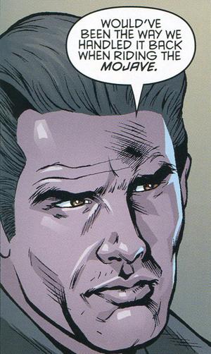 - En sus apariciones, usa tres trajes de diferentes colores: uno negro en All Roads, uno gris en su carta y uno blanco y sucio en su aparición de Fallout: New Vegas