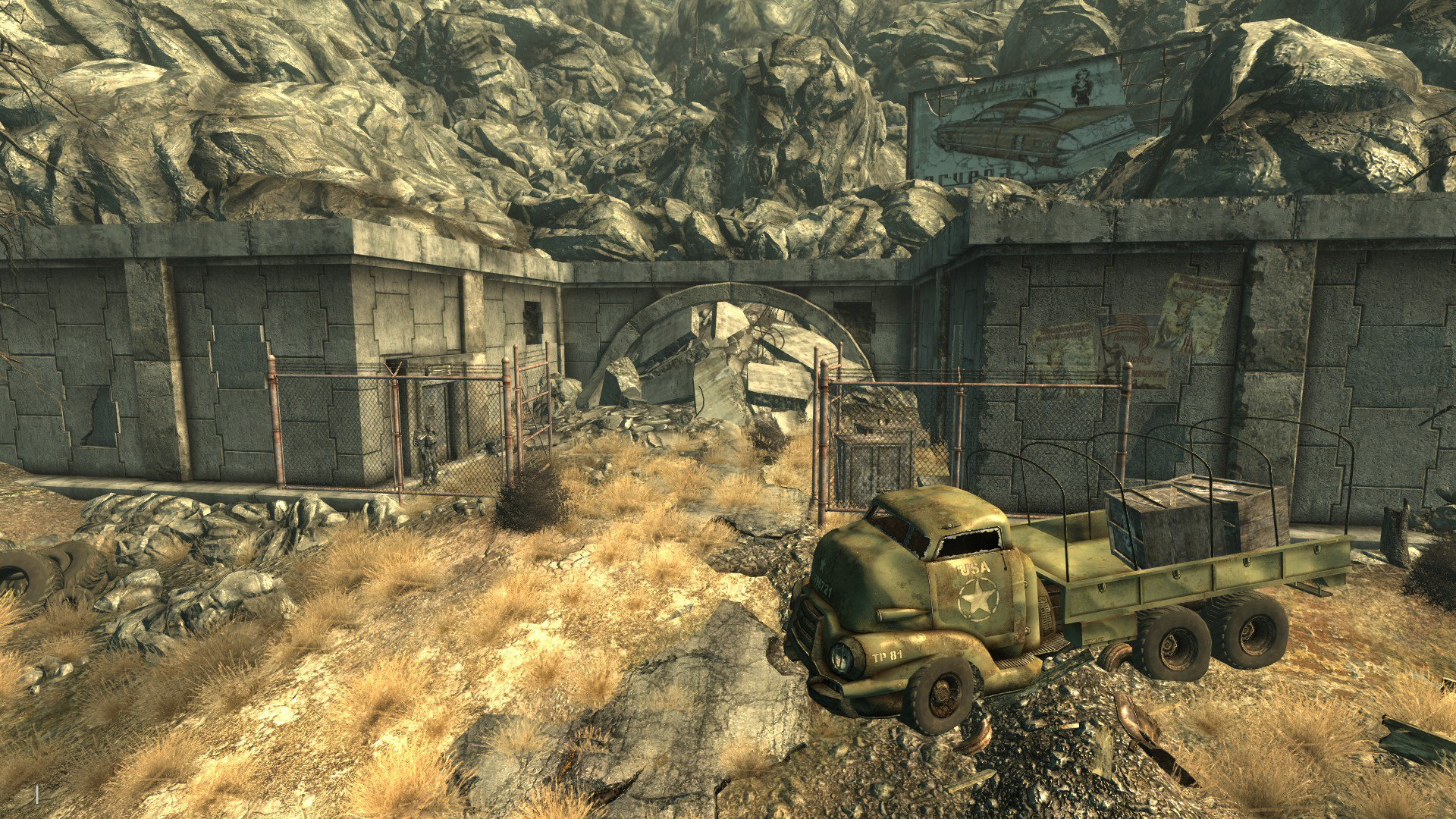 Se pueden encontrar siete Servoarmaduras de Enclave dentro del túnel, en los cadáveres apilados de los soldados de Enclave fallecidos, en una parada de autobús en el lado este de la cámara principal, así como entre las rocas a lo largo de la pared oeste. Además, varios contenedores llenos de botín aleatorio (un botiquín de primeros auxilios, dos cajas de granadas, dos cajones del Enclave y una caja fuerte abierta). Una sala justo al lado del pasillo de entrada contiene cinco cajas de municiones. Un pequeño pasillo de servicio en el extremo suroeste conecta el túnel con Yermo Capital, mientras que otro en la esquina noreste se dirige hacia la estación de repetidores del satélite.