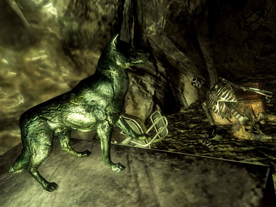 Suceso: Un cadáver petrificado y fosilizado en dolomita sólida de un perro llamado Seymour se puede encontrar en la Cueva de la Abaddon en el lado derecho de la entrada.