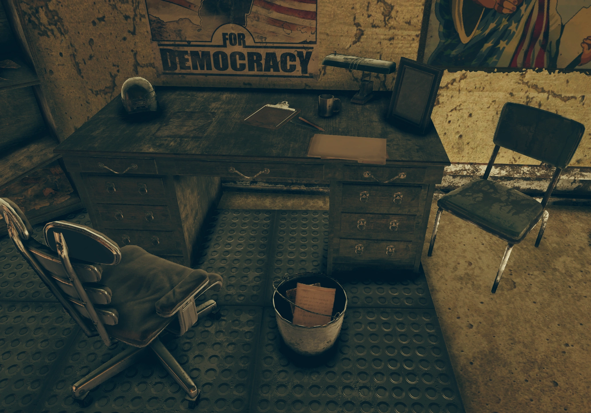 Précédemment située sur le bureau du bas, près du terminal endommagé. À partir de Wastelanders, elle se trouve maintenant en bas, sur le sol, dans un petit tas de déchets près des casiers.