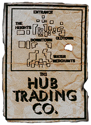 The Hub est une colonie et un centre de commerce énorme établi dans une vieille ville relativement épargnée par la Grande Guerre. De nombreuses caravanes passent par ici, transportant des marchandises vers le nord à Shady Sands, Junktown, vers le désert du Mojave et Boneyard . La ville abrite une communauté importante de commerçants, de prêteur sur gage, de joueurs, et de tout un tas d'ordures intéressées par l'argent. La grande variété de personnes y passant garantit aux voyageurs de toujours assister à quelque-chose de surprenant.