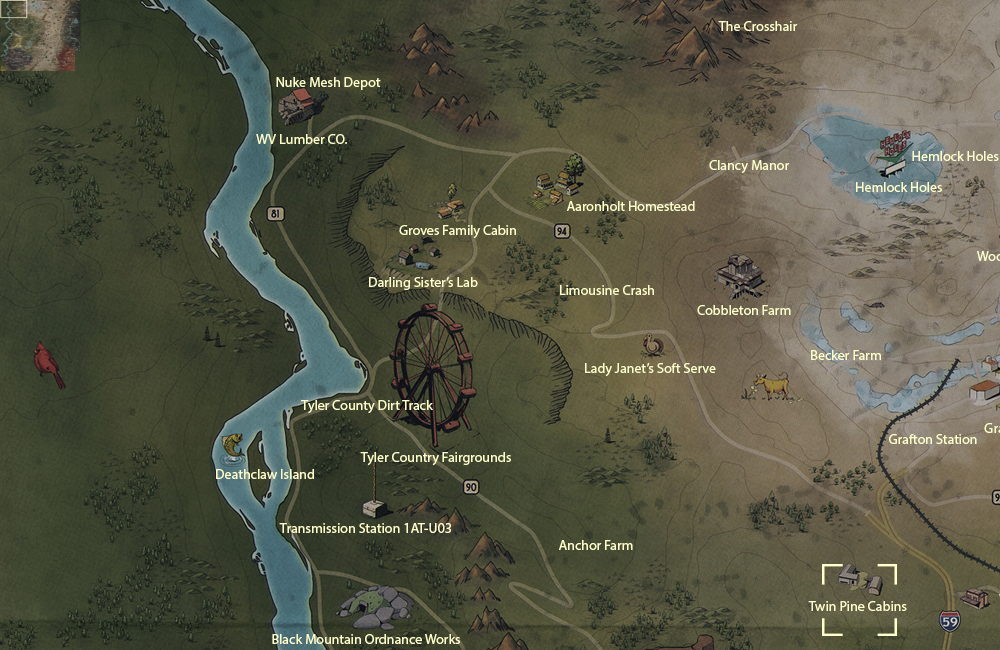 Abri 79 ·Abri 94 ·Abri 96 ·Allée de l'éventreur ·Antenne radio nationale isolée ·Ascenseur Monorail ·Barraque à barbecue de Big Fred's ·Bâtiment Dent et Fils ·Bed & Breakfast montagnard ·Bivouac US-13C ·Cabane d'enquêteur ·Camp de l'exploitation forestière Sylvie & Fils ·Camp des fils de Dane ·Camp du gang Seneca ·Camp du nord des Impitoyables ·Camp du sud des Impitoyables ·Centrale secondaire de Monongah MZ-01 ·Centrale secondaire de Monongah MZ-02 ·Centre nationale de la recherche radio astronomique ·Centre de recherche West Tek ·Chalet d'Autumn Acre ·Chalet de la famille Bailey ·Chalet de la station de ski de Sunnytop ·Chalets de Middle Mountain ·Décharge de munitions ·Décharge d'Emmett Mountain ·Déchèterie Sécuripropre ·Distillerie Yellow Sandy ·Échine du diable ·Ferme des Beckwith ·Fort Atlas (anciennement Observatoire ATLAS) Foundation (anciennement Spruce Knob) ·Gare de R&G Station ·Grotte de Hopewell ·Grotte du wendigo ·Huntersville ·La cour des miracles ·Lac Eloise ·Lacs jumeaux ·Le trou à tourbe ·Ligne régionale NCA 98 ·Maison de la citrouille ·Manoir Ingram ·Mare de Solomon ·Meat 'n Go de Larry le toxico ·Mine de Blackwater ·Mine de la chance enfouie ·Metal Dome ·Metal Dome ·Monongah (Centrale de Monongah ·Cour de la centrale de Monongah) ·Nouveau dépôt centrale des Appalaches ·Observatoire ·Palais du layon venteux ·Poste d'observation ·Poste d'observation d'altitude Centrale ·Poste d'observation d'altitude Est ·Poste d'observation d'altitude Nord ·Poste d'observation d'altitude Sud ·Poste d'observation de Skullbone ·Promontoire de Monongah ·Promontoire panoramique ·Red Rocket Mega Stop ·Seneca Rocks (Office du tourisme de Seneca Rocks) ·Services de traitement de R&G ·Site Alpha ·Site Bravo ·Site Charlie ·Site d'enfouissement fédéral HZ-21 ·Sommet du Monde (Chalets de Pleasant Valley ·Station de ski de Pleasant Valley ·Gare de Pleasant Valley) ·Spruce Knob (Campement de Spruce Knob ·Canaux de Spruce Knob ·Lac de Spruce Knob) ·Station de ski de Sunnytop (Gare de Sunnytop ·Sugar Grove ·Terre des Johnson ·Tour relais EL-B1-02 ·Tour relais LW-B1-22 ·Usine de munitions reconvertie ·Complexe de Whitespring (Club de golf de Whitespring ·Entrée de service de Whitespring ·Gare de Whitespring ·Le bunker de Whitespring bunker ·Poste d'observation de Whitespring)