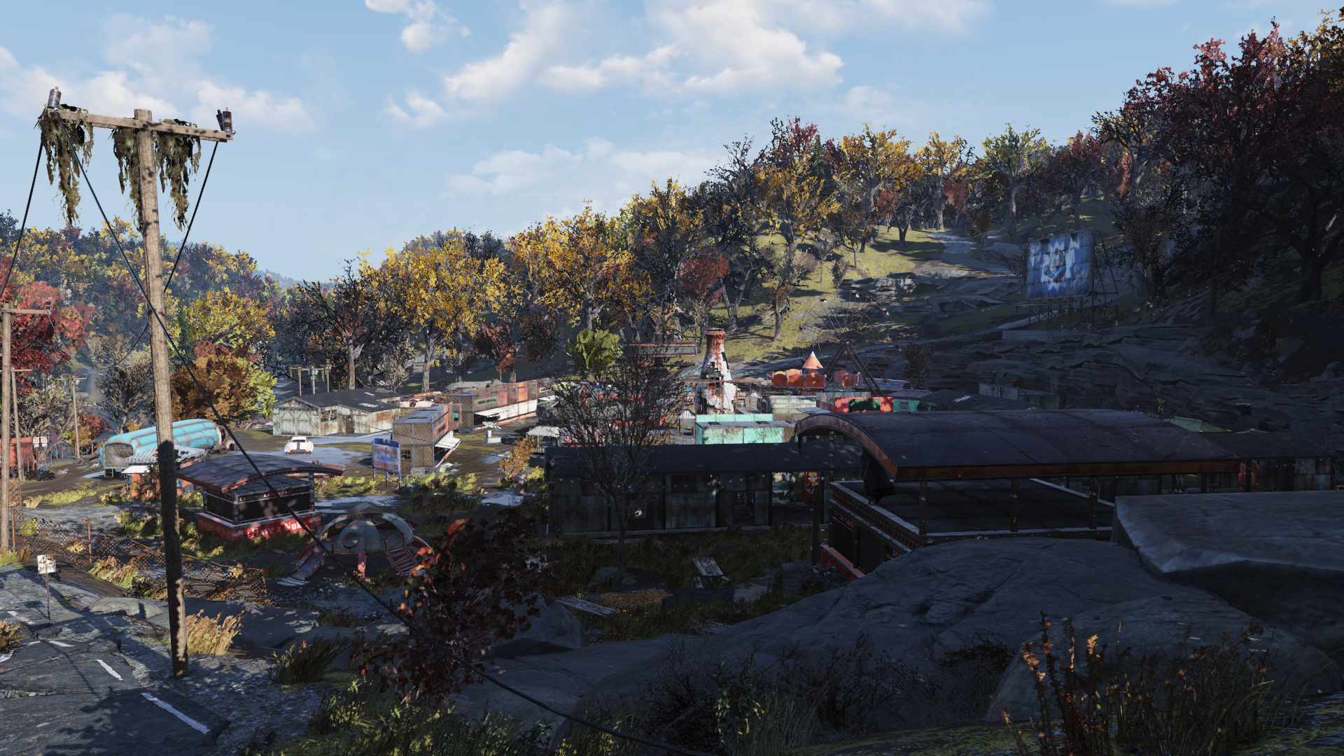 Rally Rollers (un carrousel de voitures), le Rocket Whirl (un carrousel aérien avec des voitures en forme de bouteilles Nuka-Cola), un carrousel traditionnel, et une roue Ferris constituent les attractions du champ de foire. Les amusements annexes possèdent des noms comme "Jar Toss" (sur le toit duquel il est possible de rencontrer Liebowitz, "Hole in One", "Nothing But Net", et "Bandit Roundup". Il s'y trouve également des jeux d'arcade traditionnels tels que Atomic Rollers, Red Menace, Whack-a-Commie et Hoop Shots.