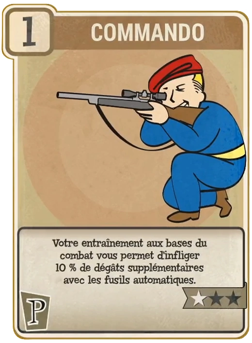 - ↑ Écrans de chargement de Fallout 76 : "L'aptitude Commando augmente les dégâts infligés avec les armes automatiques. Elle se cumule avec Commando expert et Maître commando, alors équipez-vous de ces trois aptitudes pour causer un maximum de dégâts."