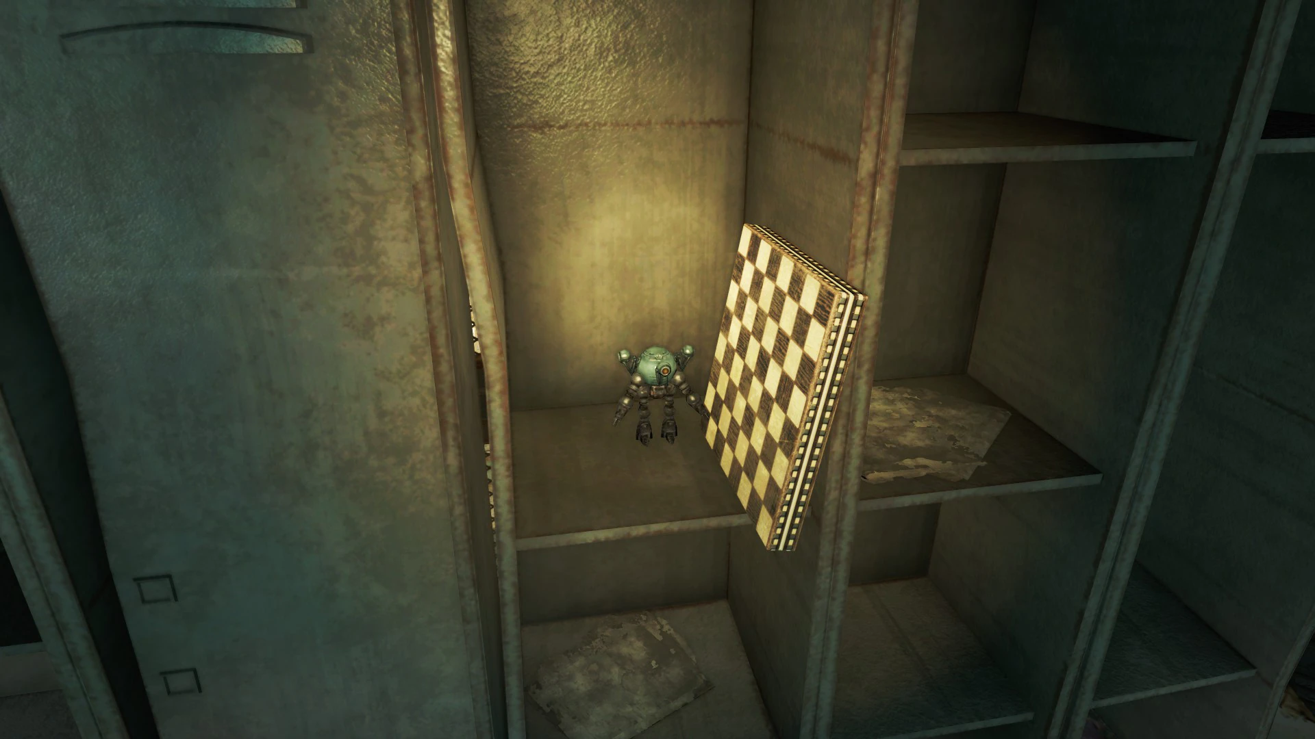 - Après être entré dans l'aile des installations, continuez jusqu'à atteindre une rampe grillagée descendante. Sautez sur le rebord, puis par-dessus le tuyau situé sur votre gauche. Là, vous trouverez un Jangles singe lunaire et un singe mécanique jouant au célèbre jeu vidéo, Pong, tout en buvant deux Nuka-Cola Quantum.